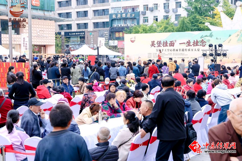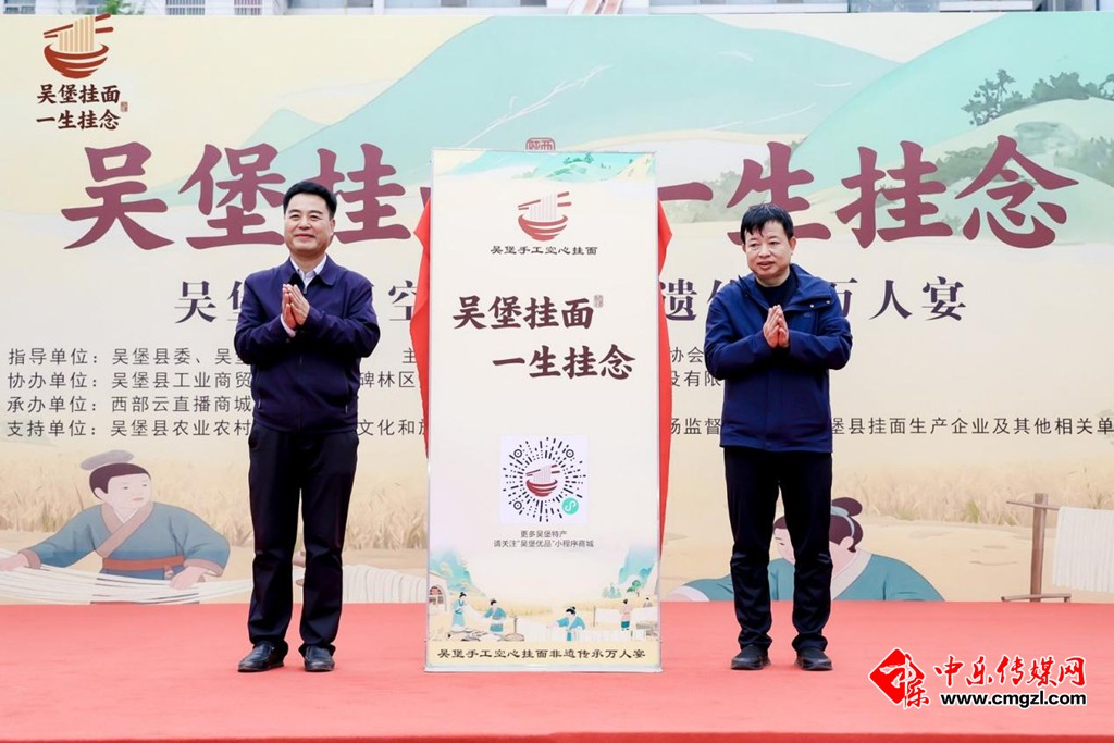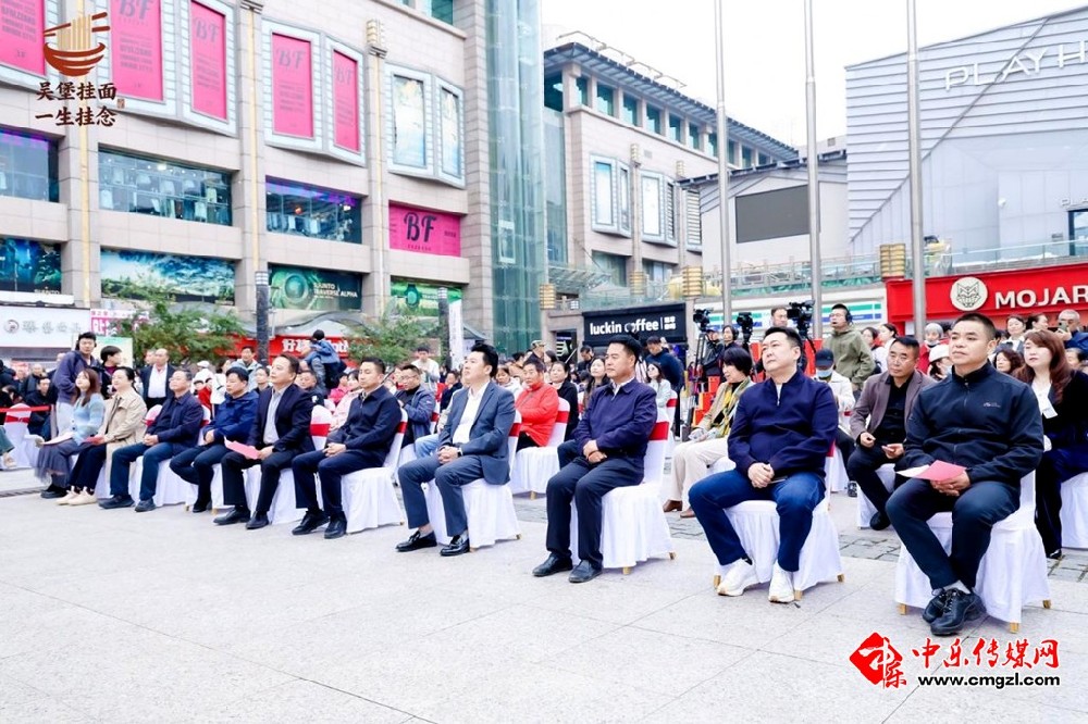 中乐融媒网讯 “吴堡挂面 一生挂念”10月18日,西安市钟楼兴正元广场人声鼎沸、面香四溢,吴堡非遗挂面宴在此热闹开席。中共吴堡县委副书记魏国,县政府党组成员王德烽,吴堡县工业商贸局局长高利斌,吴堡县工业园区管委会副主任王海军,碑林区商务局局长张彤,碑林区文化旅游局副局长杨宁、碑林区网信办副主任田静、碑林区工会副主席冯亮等两地领导,与西安市直播电商协会会长杨森然、西部云直播商城总部基地总裁雷丽君出席活动,数千市民游客齐聚一堂,共赴这场美食与文化的狂欢盛宴。