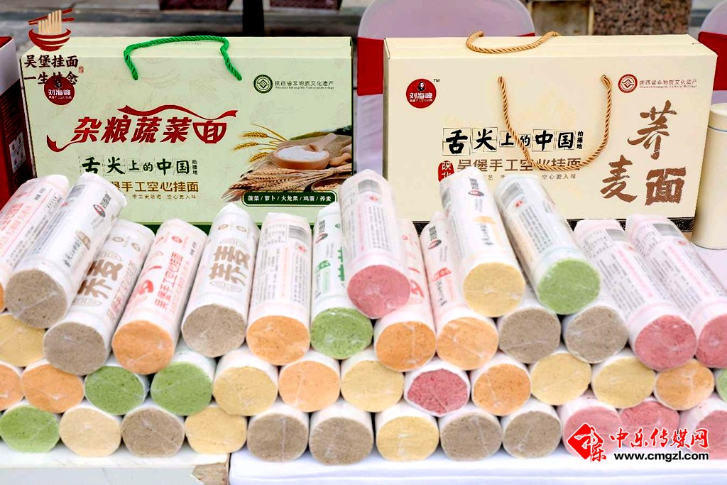 作为上过《舌尖上的中国》的非遗美食,吴堡手工空心挂面有着“天下第一挂面”的美誉,其制作技艺始于隋唐,盛于明清,历经千年传承至今。活动现场,非遗传承人带来的挂面制作展演成为焦点:和面、搓条、上筷子、醒面、分面……一道道工序行云流水,数千根细若发丝的手工空心挂面在阳光下如帘垂挂,甚至能吹起泡泡,引得观众纷纷驻足拍摄。“这手艺太神奇了,每根面都藏着老祖宗的智慧。”西安市民李女士感慨道。